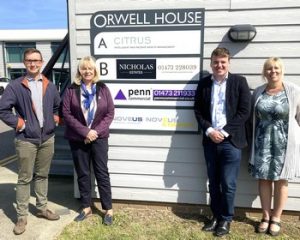 Photo (l-r): Penn Commercial’s Robin Cousins (far left) and Vanessa Penn, with Rachael Jackson (far right) and Ipswich MP Tom Hunt