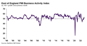 High interest rates and inflation were partly behind a slowing in private sector business activity in May but the outlook and jobs growth remain strong, according to a key survey of purchasing managers. The NatWest East of England PMI® business activity Index posted 51.7 in May, down from 53.1 in April, signalling a slower growth in output. Some firms said that high interest rates and inflation had deterred new business as well as excess stocks at clients. Growth in demand for services eased since April and manufacturing new orders fell at a faster rate. But private  firms in the region still reported higher business volumes in May for the fifth month running and the survey pointed to an overall confidence among private sector firms that output will rise over the next 12 months. Sentiment was little-changed on April’s 14-month high and firms widely expect an uplift in the economy once inflation falls further and interest rates have peaked. Private employment in the region rose for the fourth month running with recruitment driven by service providers. The May figures signalled another sharp rise in input price inflation with steeper cost increases at service providers and linked to wage pressures. But the rates of inflation for costs and charges eased in May after an uptick in April.  Rashel Chowdhury, NatWest Midlands and East regional board, said: “In line with the wider UK trend, growth of output and new work in the East of England lost some momentum in May as high inflation and rising interest rates stifled demand….More encouragingly, the 12-month outlook remained relatively strong as firms expect an easing of inflation to stimulate demand later in the year.”