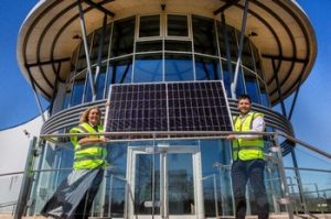 Fearn Ainsworth, RNAA Commercial Development Manager and Oliver Denison, Head of Sustainability at Indigo Swan with one of the solar panels at the Norfolk Events Centre.