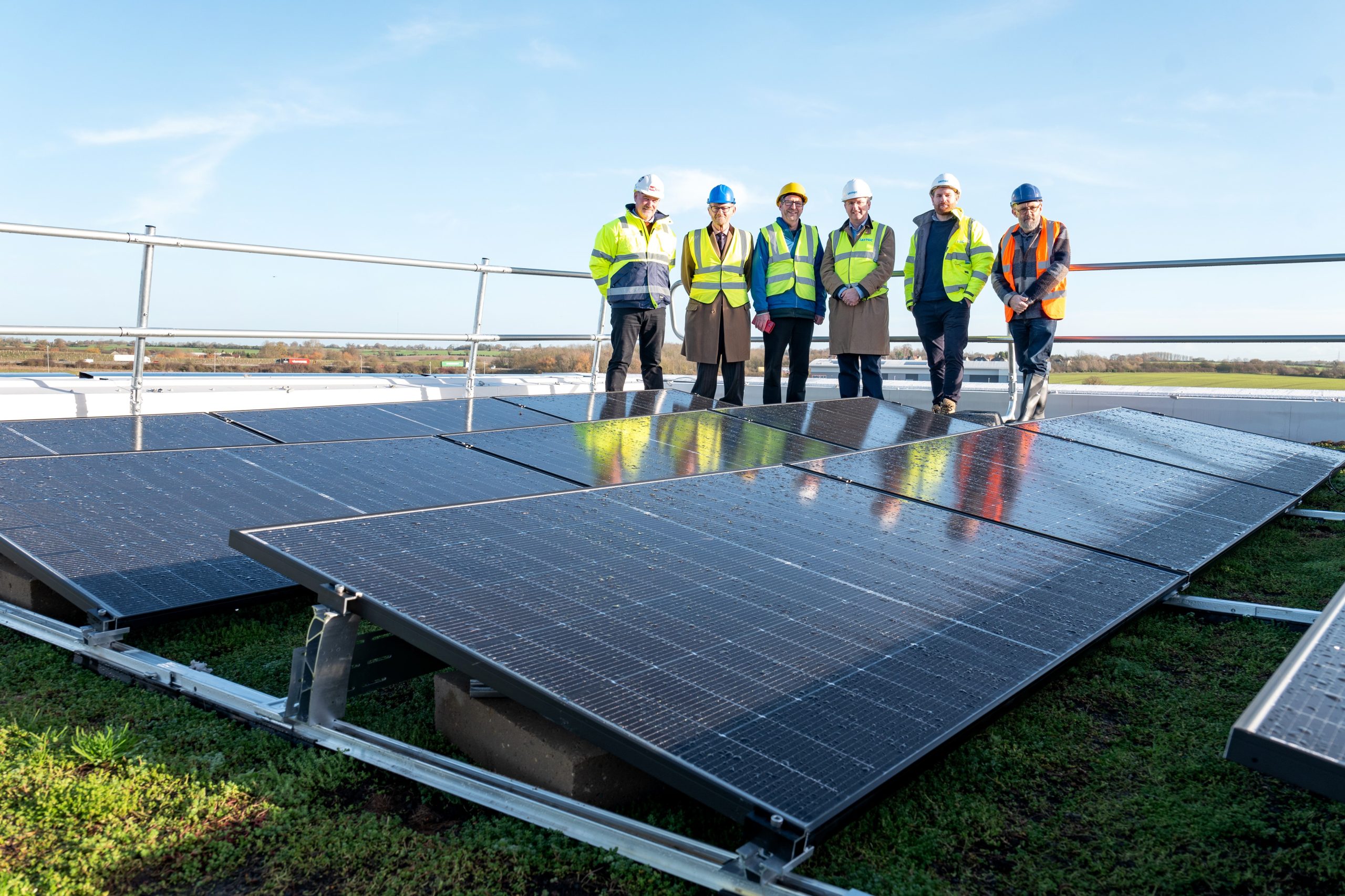 Photo: (l-r) Alistair Wilson (Wilten), Sir Christopher Haworth (Gateway 14 ), Cllr Richard Winch (Mid Suffolk DC), Steve Beel (Freeport East), Joe Clarke (Jaynic) and Cllr Andrew Stringer (Mid Suffolk DC) at the topping out ceremony.